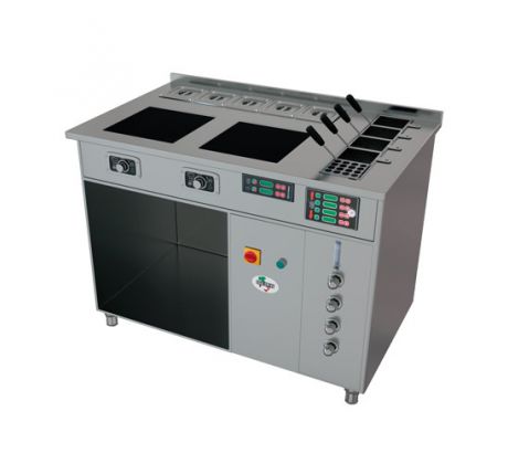 rozmer: 1310x800x900mm(šxhxv); príkon elektro: 10,4kW/400V; počet vstavaných indukčných varných platní: 2ks; rozmer vstavanej platne: 300x320mm; príkon vstavanej platne: 2,6kW/ks; rozmer GN: 5 x GN1/6 - 150mm; počet GN vstavaného vod. kúpeľa: 5ks; počet košov vstavaného variča: 4ks; rozmer koša: 115x115x175mm; automatický zdvih košov programovatelný pre každý koš osobitne; objem vane: 10 l