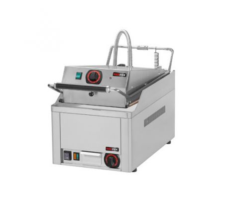 rozmer: 330x660x400mm(šxhxv); príkon elektro: 3kW/230V + 3kW/230V; rozmer platne: 320x480mm(šxh); rozmer vrchnej platne: 320x380mm(šxh); regulácia teploty: 50–300°C ; prevedenie:; -spodná platňa chromovaná, hladká; -vrchná platňa s teflónovým plátnom, hladká; každá platňa samostatne ovládaná; zásuvka na odkvapkávajúci tuk; škrabka