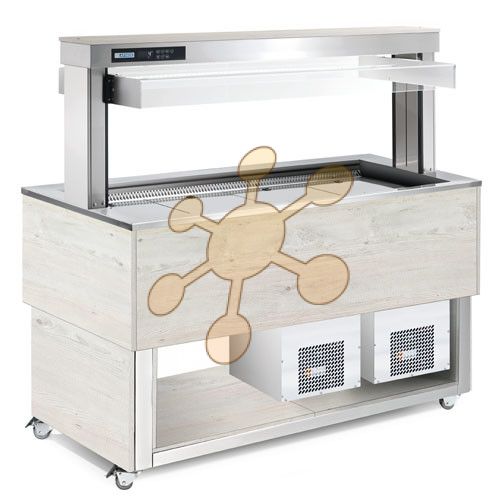 rozmer: 1494x760x1488mm(šxhxv); príkon elektro: 0,49kW/230V; kapacita: 4 x GN1/1 - 150mm; chladenie: ventilované; prev. teplota: +4/+8°C; elektronická riadiaca jednotka; prevedenie: hemlock, wenge,; RAL za príplatok +10%; 4 kolieska, 4 brzdené; nerezová vaňa; podstavba: krytovaná z bokov so spodnou policou; nadstavba: pevná s odkladacou policou; elektrické spúšťanie a zdvíhanie zákrytu; max. teplota/vlhkosť okolia +25°C / 60%R.H.; príslušenstvo na objednávku:; -bočné manipulačné plochy ; -prídavné vstavané skrinky; -gastronádoby; -falošné dno vane nerez 532x326mm/GN1/1